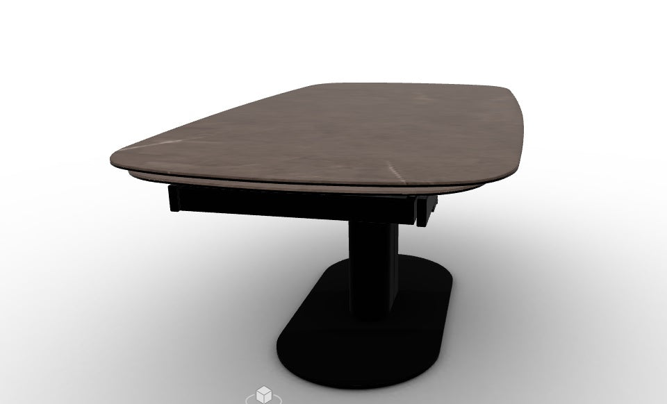 CAMEO is an extendable table with a sharply defined oval silhouette which imbues it with a powerful personality and not only provides stability but allows the space beneath the top to be used to the utmost. Made from coated metal, the central column supports the various types of tops; a metal/wood combination is invariably refined whereas the mixture of metal and ceramic with a marble effect creates a playful contrast between cold and warm materials and is edgily modern.